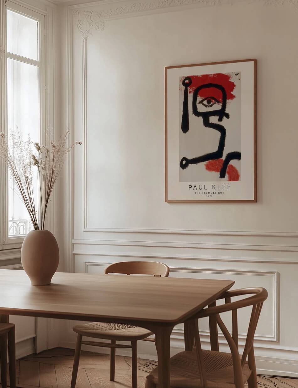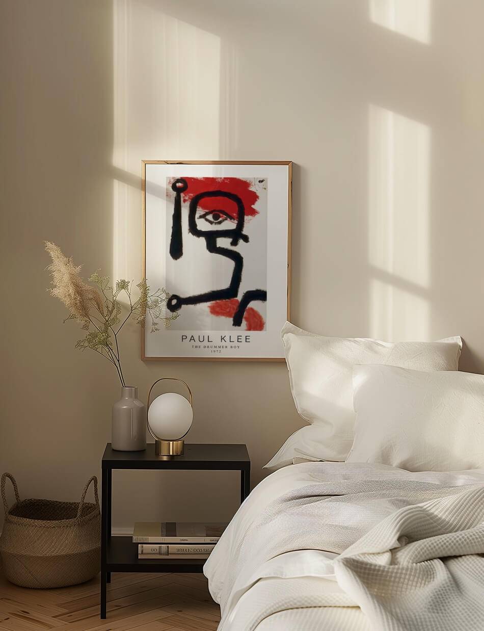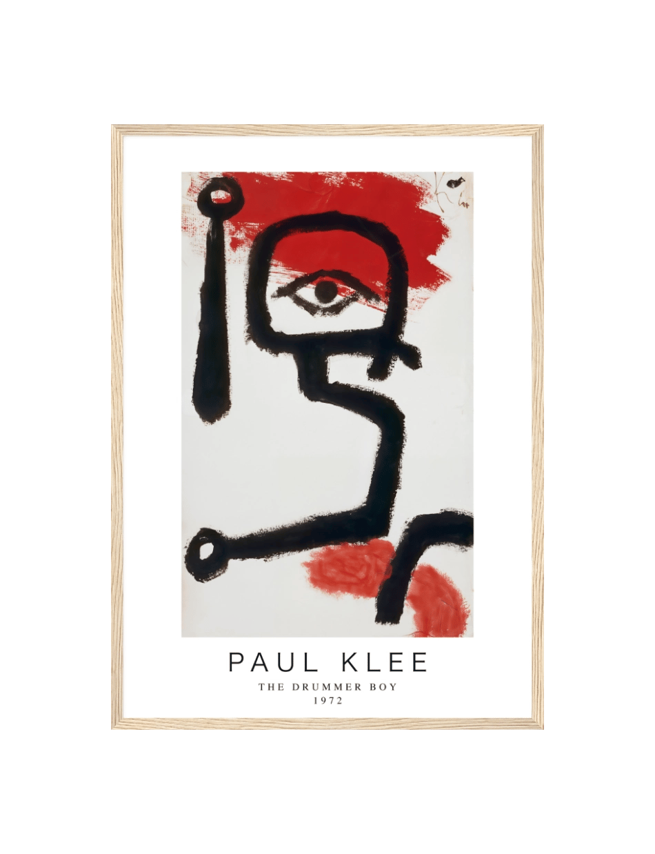 The Drummer Boy af Paul Klee er et kraftfuldt værk, der bruger sorte, markante linjer til at skildre en abstrakt figur med en stærk, rytmisk energi. En stor rød flade bagved og omkring figuren giver værket en intensitet, der straks fanger opmærksomheden. Den skarpe kontrast mellem det sorte og det røde fremhæver værkets dynamik og skaber en følelse af bevægelse og styrke.