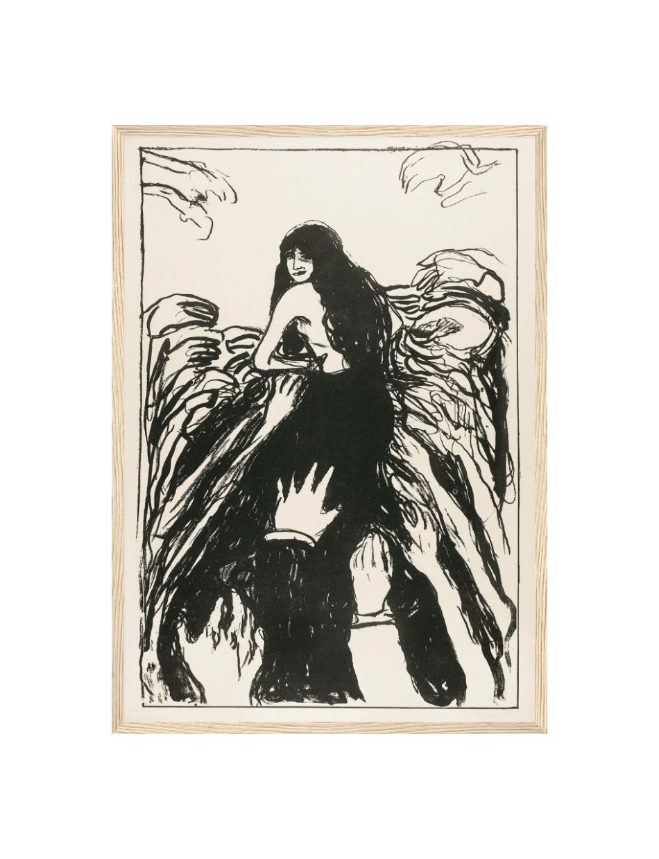 The Hands, skabt af Edvard Munch, er et dramatisk og følelsesladet værk, der viser en kvinde omgivet af abstrakte, udstrakte hænder. Kvinden ser tilbage med et mystisk smil, mens hendes lange hår flyder frit og danner en forbindelse mellem hende og de omgivende hænder. Hænderne, der strækker sig mod hende, kan symbolisere længsel, begær eller beskyttelse. Munchs brug af sort-hvide kontraster og ekspressive linjer fremhæver intensiteten og det følelsesmæssige drama i scenen, hvilket giver værket en stærk visuel og psykologisk effekt.