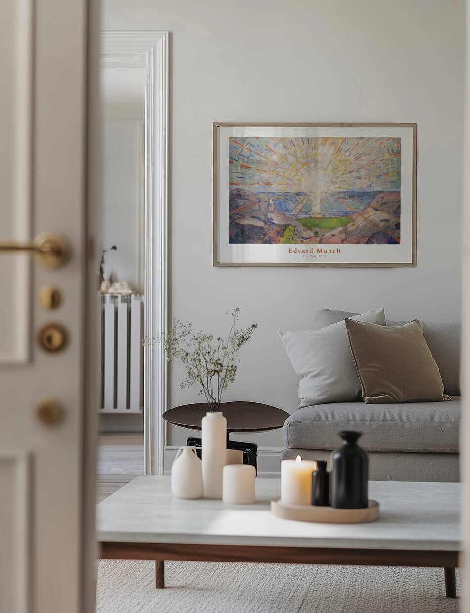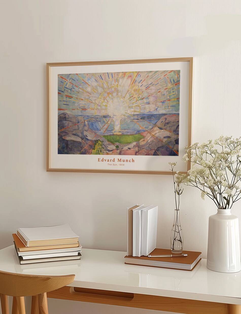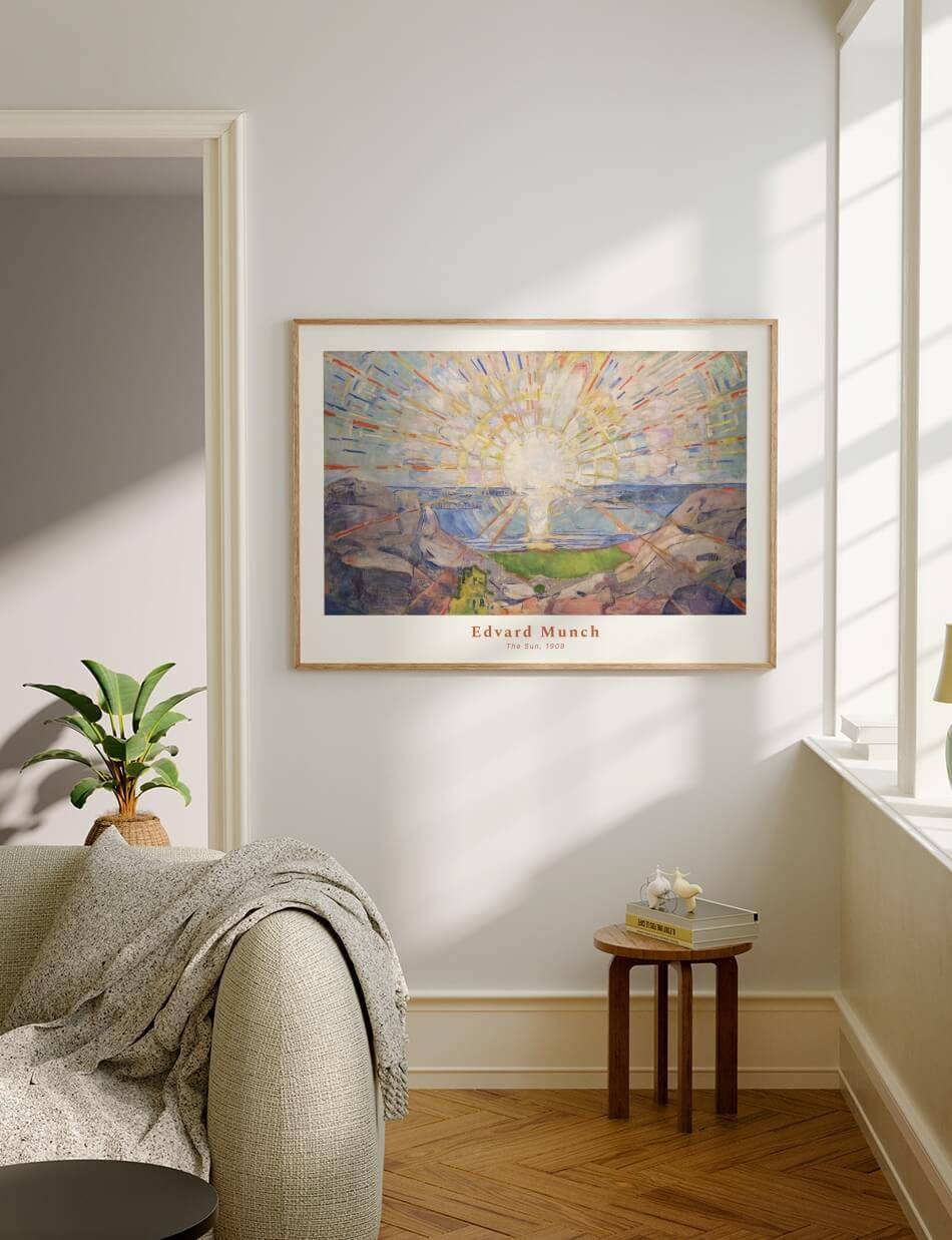 The Sun, malet af Edvard Munch mellem 1912 og 1913, er en kraftfuld tolkning af solens energi og lys. Værket viser en strålende sol, der udsender farverige stråler over et landskab af klipper og hav. De dynamiske penselstrøg og den levende farvepalette skaber en følelse af bevægelse og vitalitet, der fylder hele kompositionen. Dette maleri indfanger solens transformative kraft og dens evne til at bringe lys og liv til verden. Det er en hyldest til naturens skønhed og dens evige cyklus.