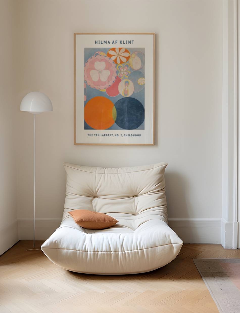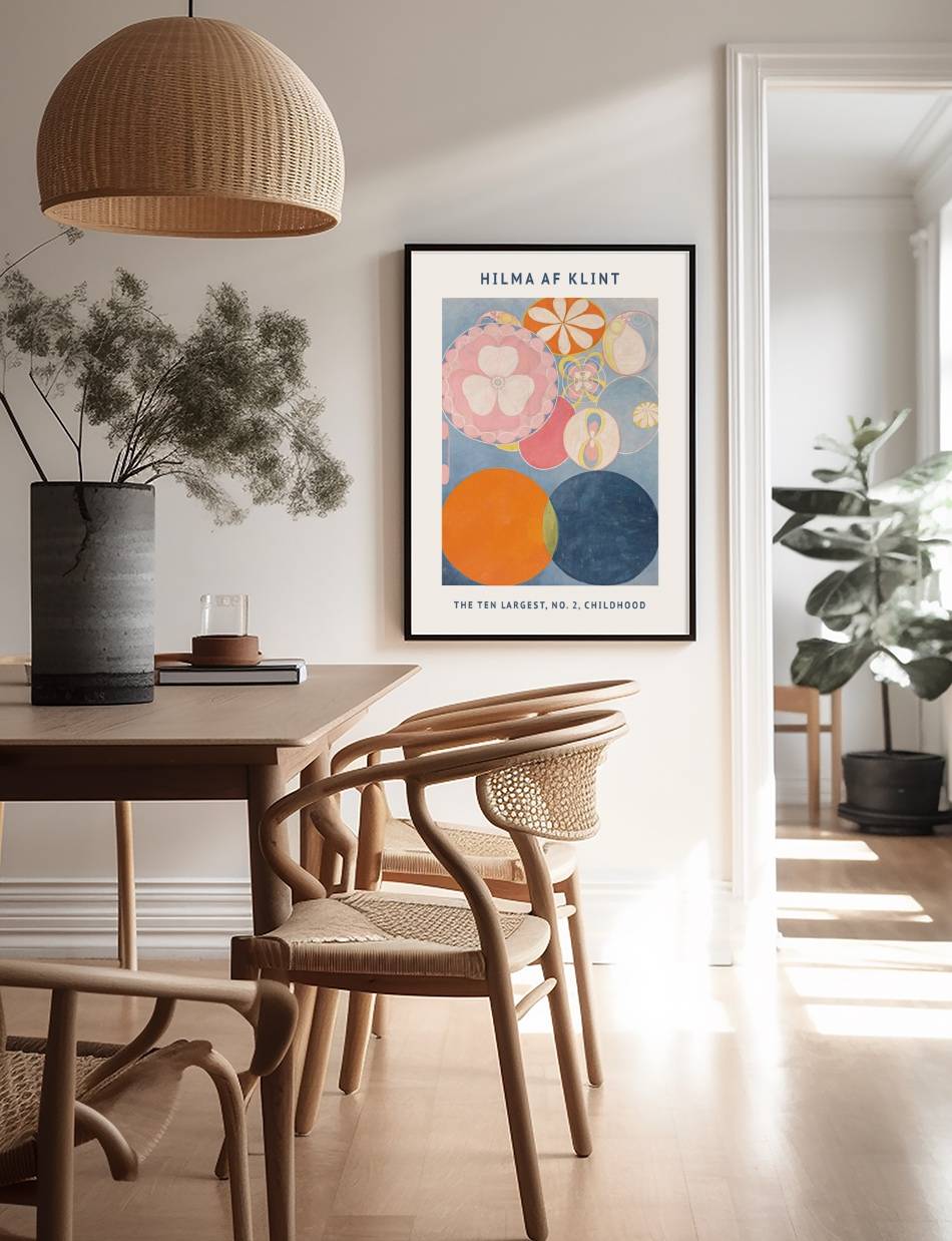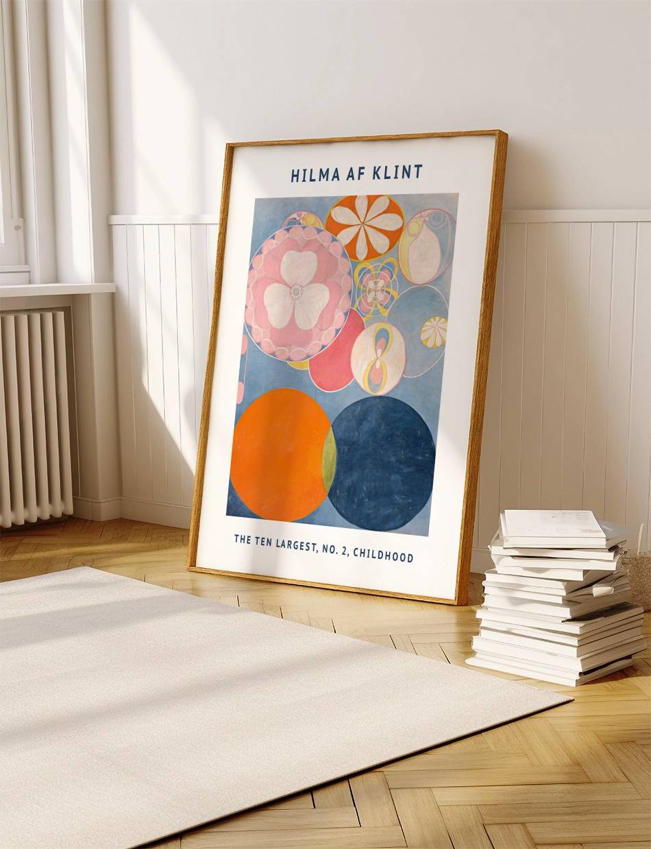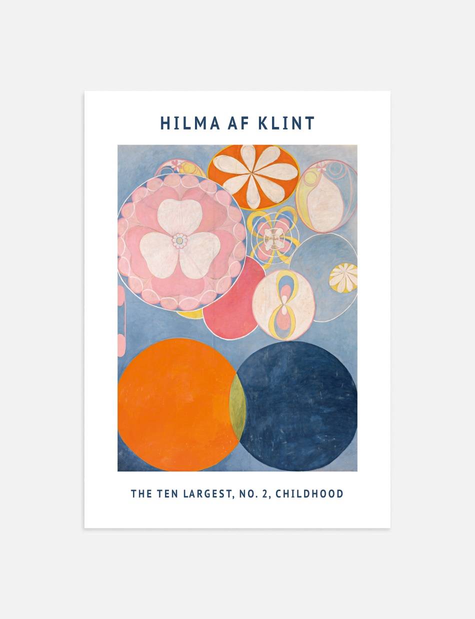 The Ten Largest, No. 2, Childhood af Hilma af Klint, udforsker barndommens uskyld og nysgerrighed gennem abstrakte former og levende farver. Denne plakat inviterer til refleksion over livets tidlige stadier med en dybde og kompleksitet, der beriger ethvert hjem.