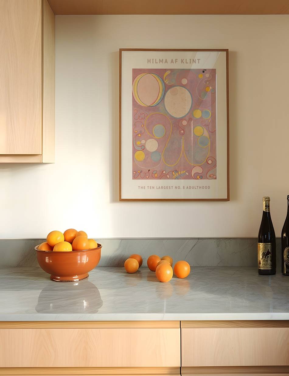 Opdag The Ten Largest No 8 fra Hilma af Klints Adulthood serie – en storslået fortolkning af voksenlivets dynamik. Dette kunstværk indfanger essensen af personlig udvikling og følelsesmæssig dybde gennem dristige farver og abstrakte former, der inviterer beskueren til en rejse gennem livets stadier.