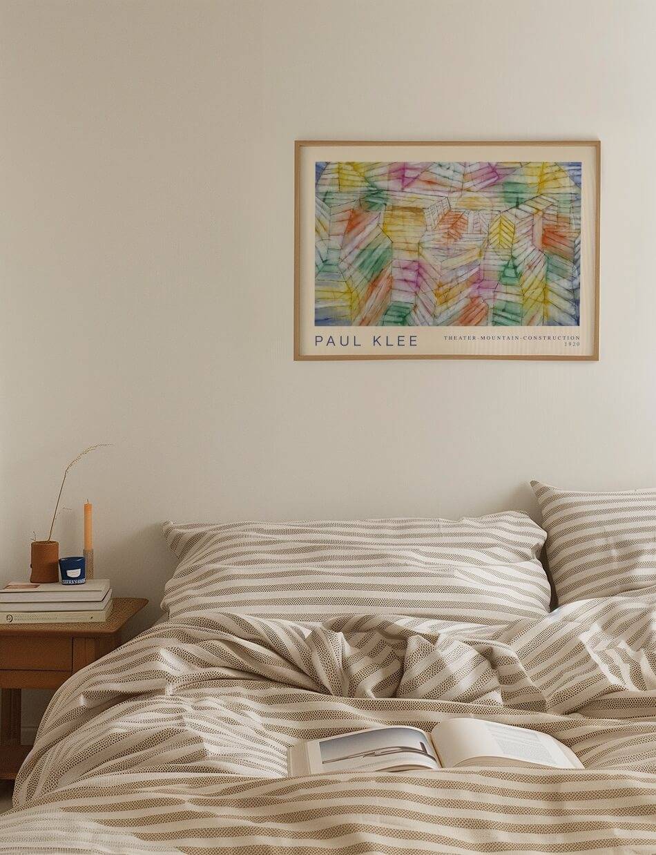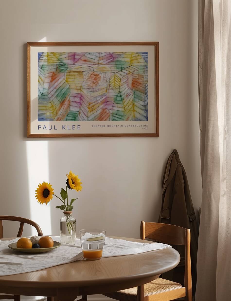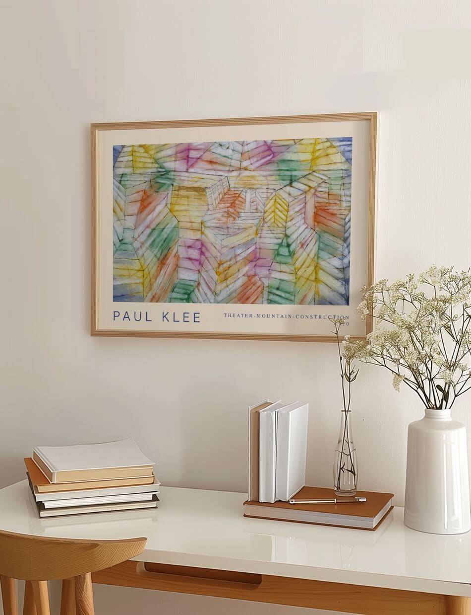 Denne plakat viser Paul Klees “Theater-Mountain-Construction” fra 1920. Værket er en fascinerende blanding af geometriske former i bløde pastelagtige farver, der skaber et drømmeagtigt, kubistisk landskab. Med sine lagdelte strukturer og lette, luftige toner inviterer maleriet til at udforske et surrealistisk sceneri, der balancerer mellem det arkitektoniske og det naturlige. Et perfekt eksempel på Klees evne til at forene abstraktion med poetisk følsomhed, der vil tilføje dybde og karakter til enhver væg.