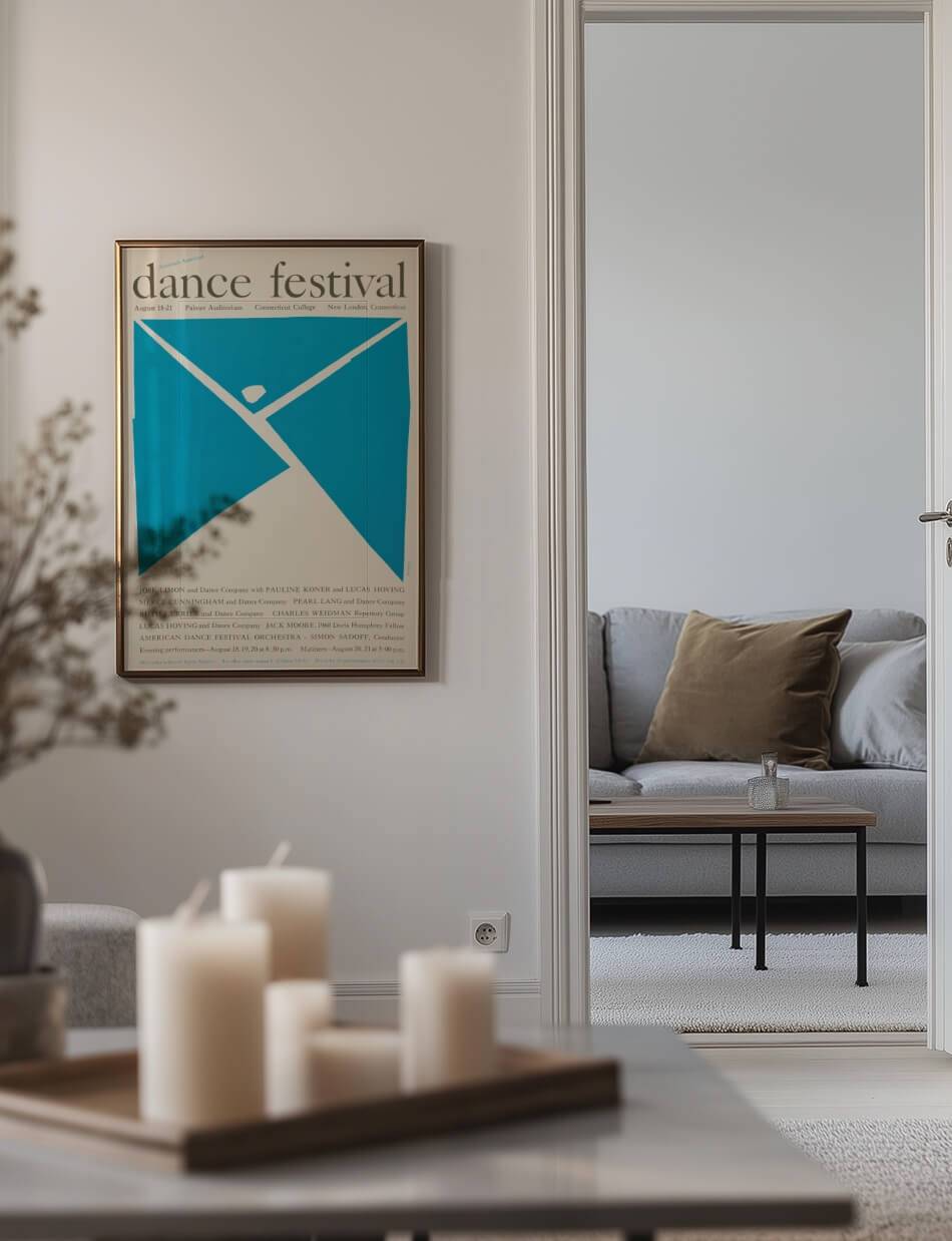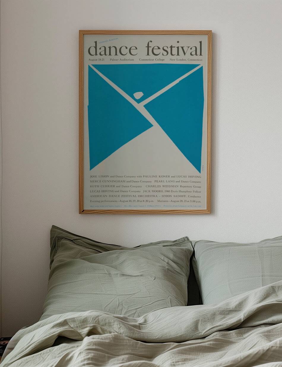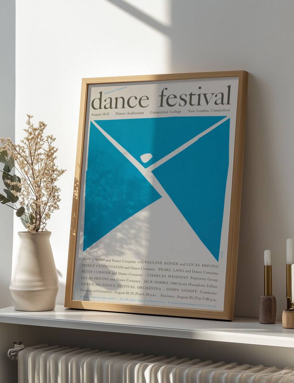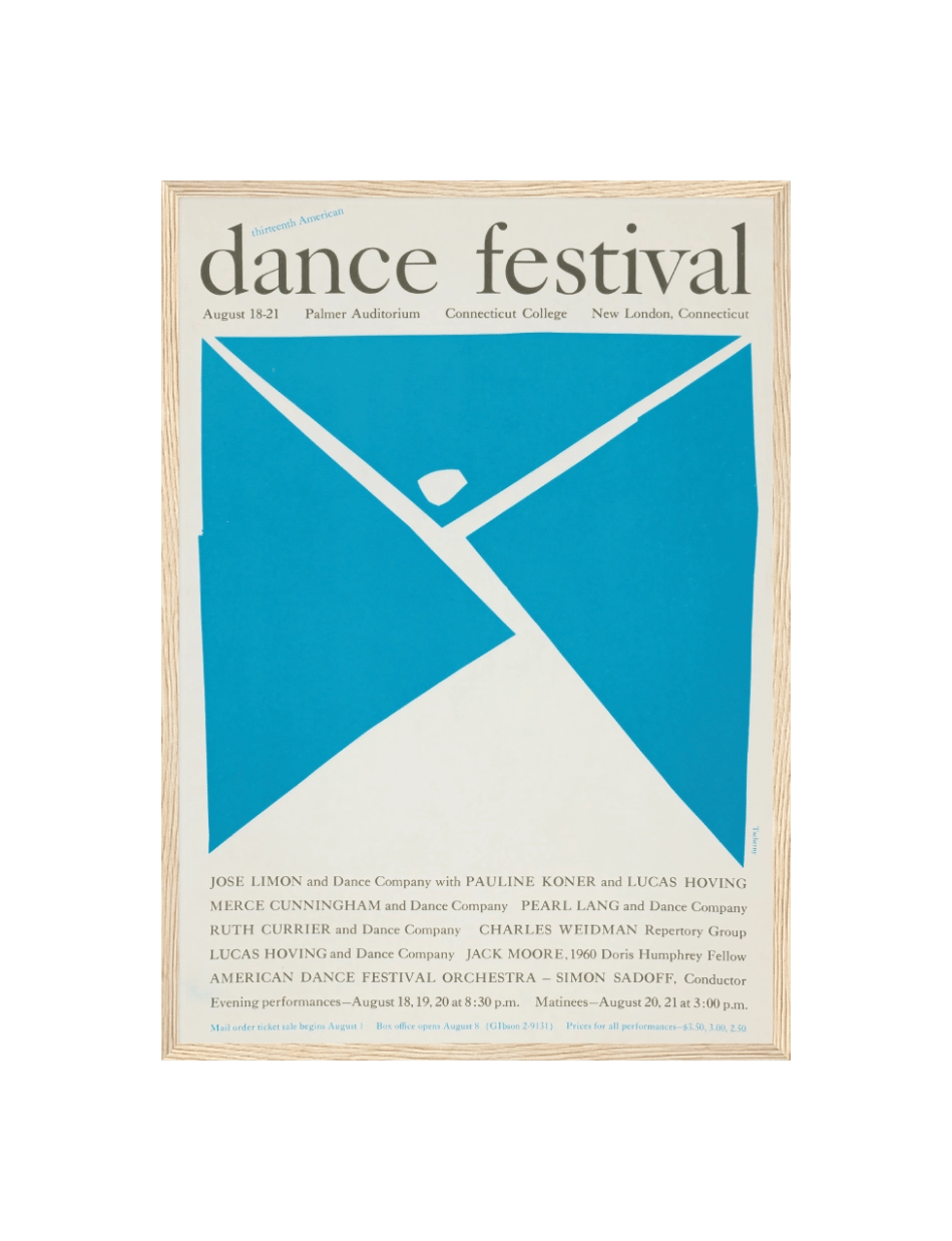Denne elegante plakat fra 1960 annoncerer den trettende amerikanske dansefestival. Den minimalistiske design bruger dristige geometriske former i blå og hvid til at skabe en abstrakt repræsentation af en danser i bevægelse. Plakaten indeholder detaljer om begivenheden, herunder datoer, sted og prominente dansekompagnier. Et tidløst stykke kunsthistorie, der perfekt indfanger ånden i moderne dans og grafisk design fra midten af det 20. århundrede.