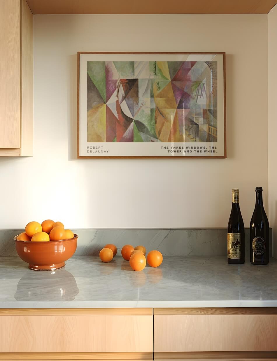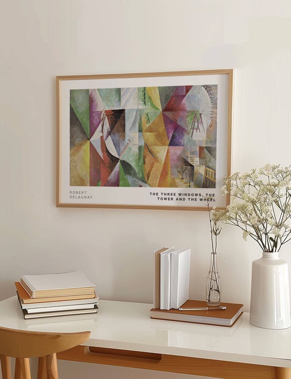 Three Houses’ af Paul Klee fra 1922 præsenterer en rolig og harmonisk scene gennem abstrakte former og en blød farvepalet. Værket viser tre huse i forskellige geometriske former, der står side om side i et landskab af grønne og blå nuancer. Klees brug af enkle linjer og subtile farveovergange skaber en følelse af balance og fred. Dette kunstværk inviterer til at reflektere over skønheden i det enkle og det harmoniske i hverdagen.