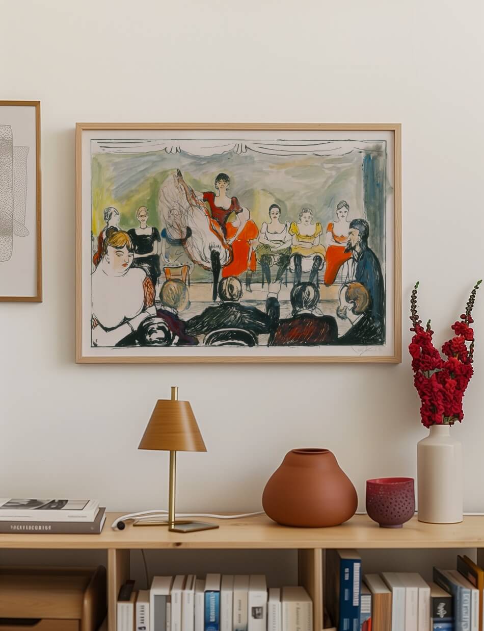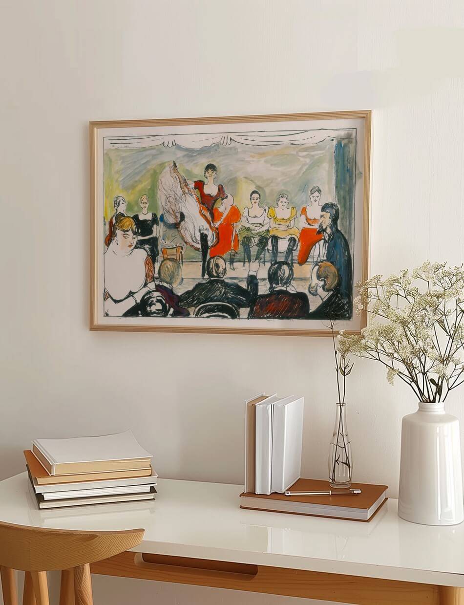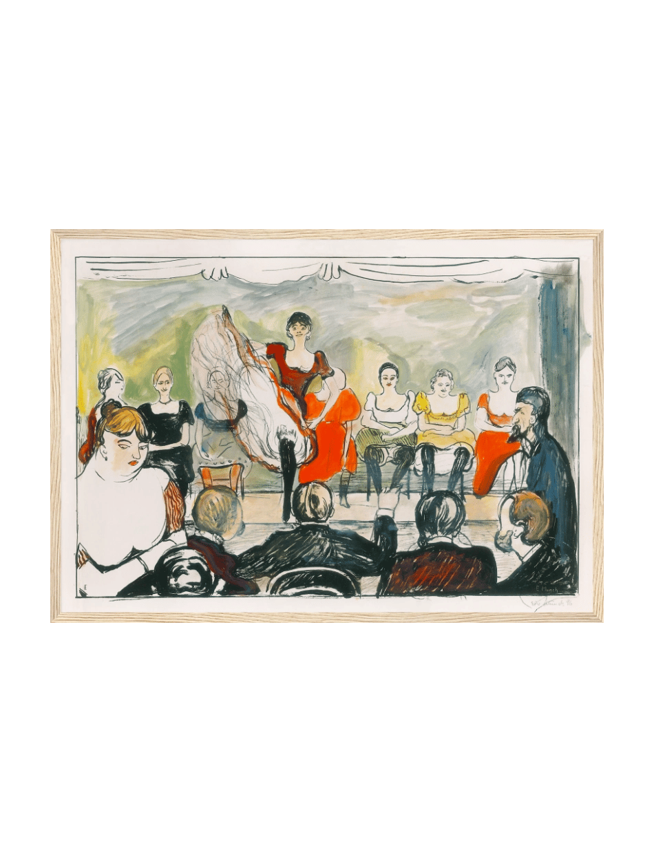 Tingletangle, malet af Edvard Munch, viser en livlig scene fra en kabaret med en gruppe kvinder på scenen og publikum i forgrunden. Kvinderne er klædt i farverige kjoler, og en af dem er fanget midt i en energisk dans. Publikum består af forskellige individer, hver med deres reaktion på forestillingen, hvilket tilføjer en dynamisk interaktion mellem scenen og beskuerne. Munchs brug af levende farver og ekspressive linjer fanger atmosfæren og energien i kabaretlivet.