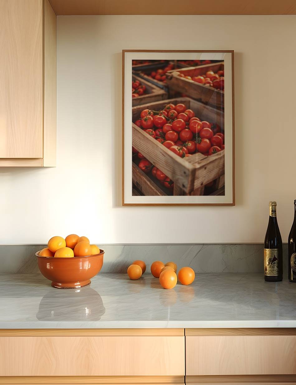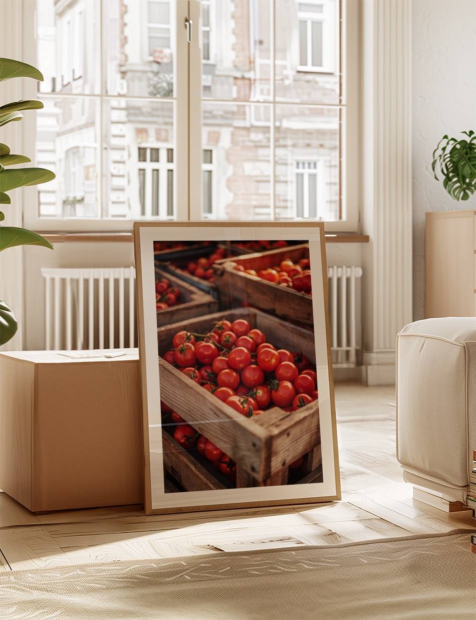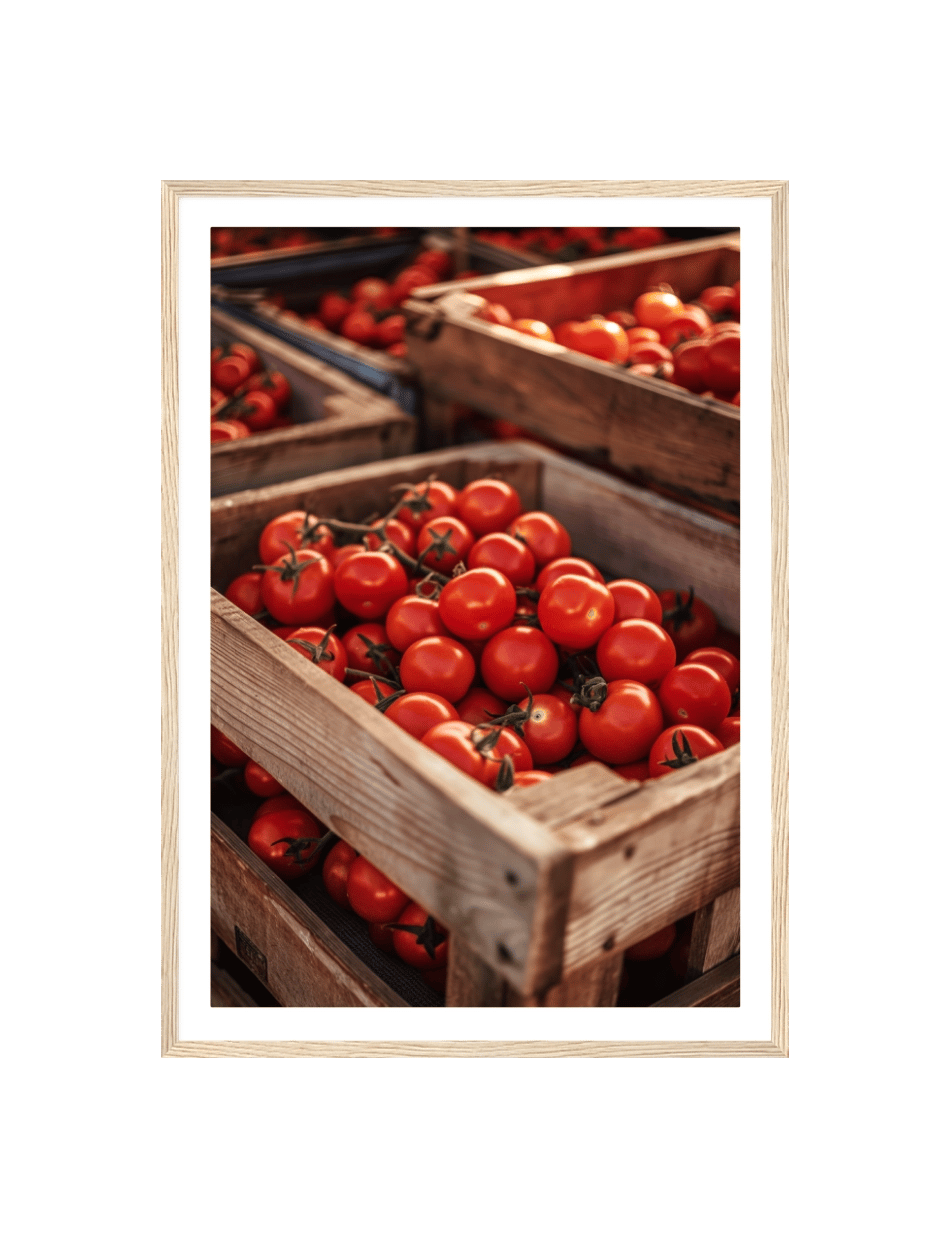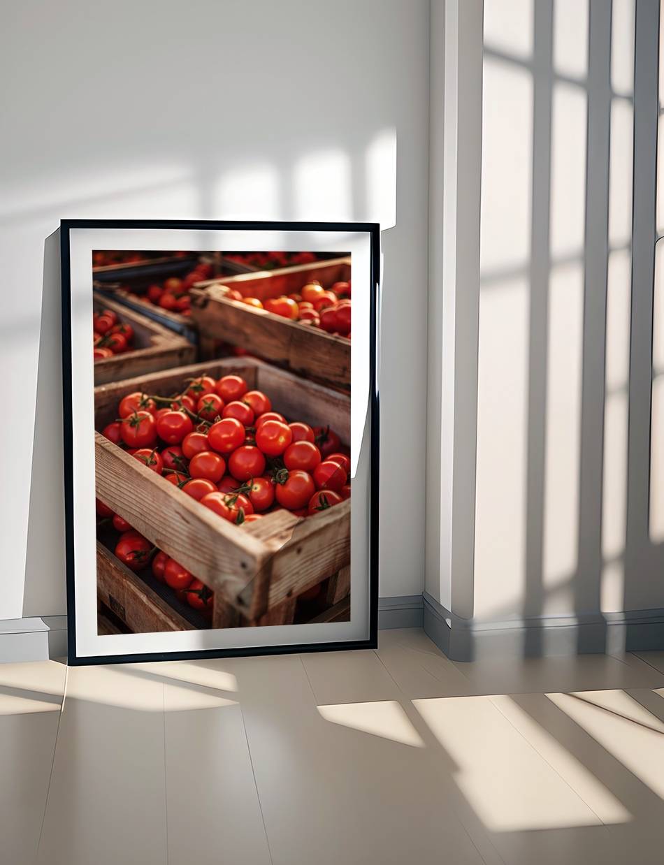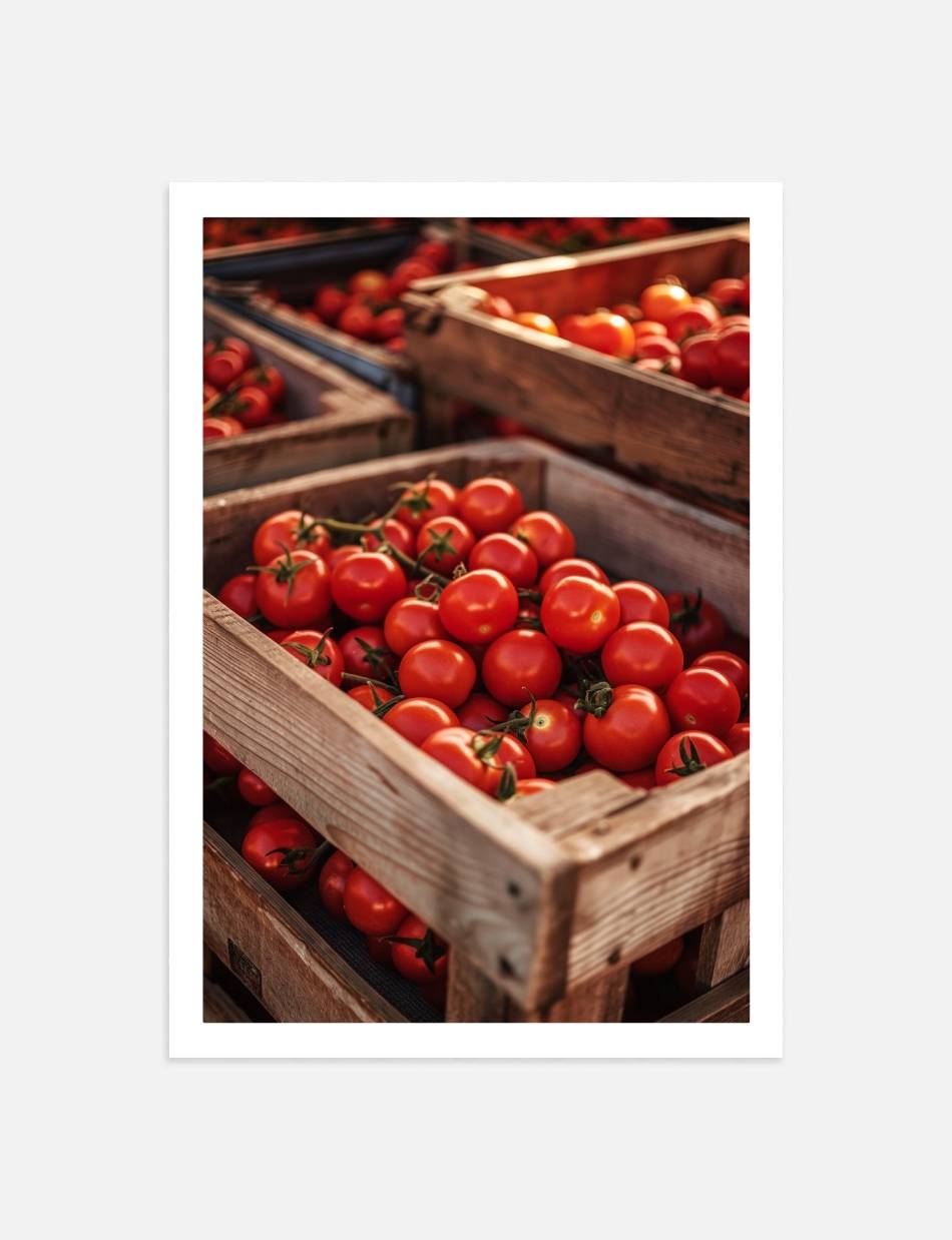 Oplev den autentiske smag af solmodne tomater. Dette billede fanger den livlige røde glød af friskhøstede tomater, præsenteret i rustikke trækasser. Perfekt til at bringe en følelse af sommerens friskhed ind i ethvert køkken eller spisestue.
