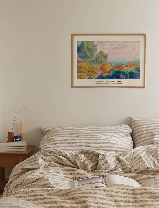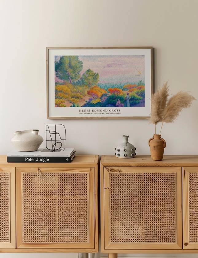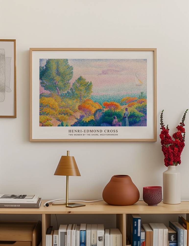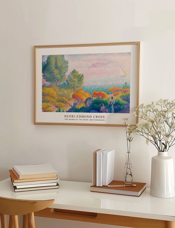 Henri-Edmond Cross’ Two Women by the Shore, Mediterranean fanger en idyllisk scene ved Middelhavet, hvor to kvinder nyder naturens skønhed. Maleriet er fyldt med lyse, varme farver, der skildrer en frodig flora og en rolig havudsigt med en sejlbåd i horisonten. Cross’ punktteknik skaber en livlig og detaljeret komposition, der indbyder dig til at deltage i en fredfyldt stund ved kysten. Ideel til dem, der ønsker at bringe en følelse af ro og naturlig skønhed ind i deres hjem.