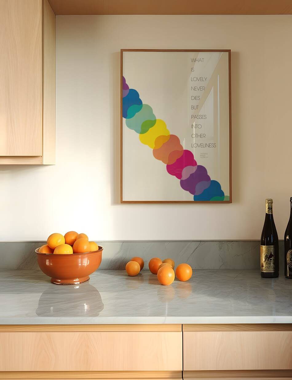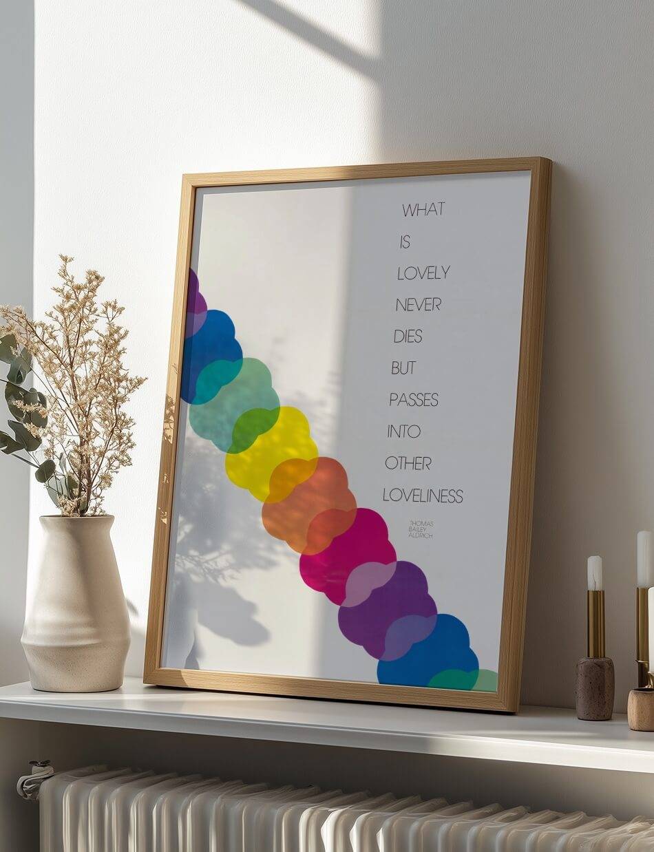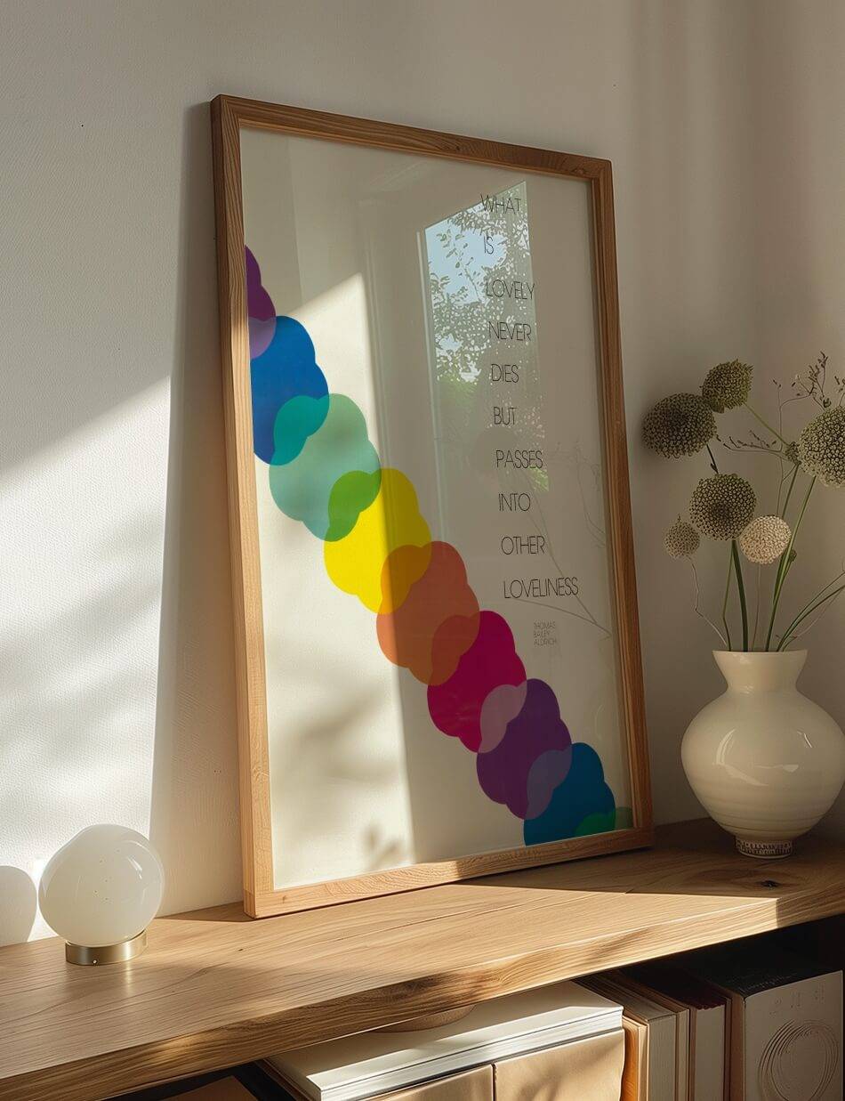 Denne plakat, skabt af U.S. Information Agency, er en visuel hyldest til skønhedens evige natur. Med en smuk række af overlappende, farverige cirkler, symboliserer den, hvordan skønhed aldrig forsvinder, men blot ændrer form. Det inspirerende citat af Thomas Bailey Aldrich, “What is Lovely Never Dies But Passes Into Other Loveliness”, er elegant præsenteret langs siden, hvilket tilføjer en dyb poetisk dimension til plakaten. Perfekt til at minde os om, at skønhed er evig og konstant forvandles.