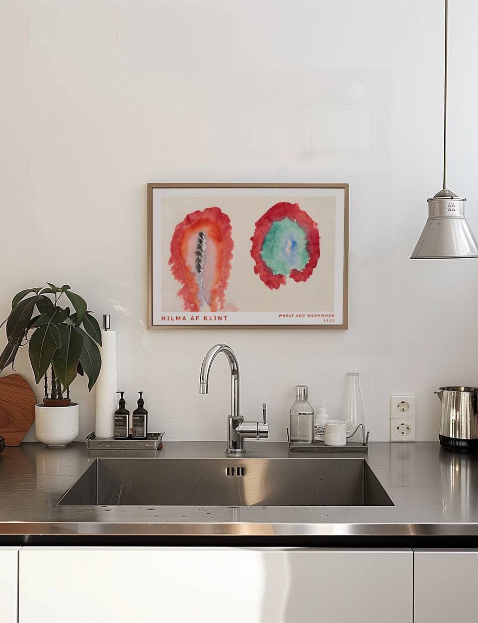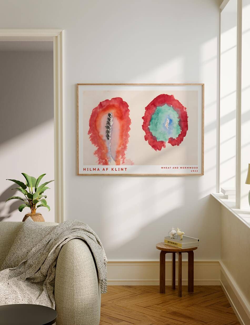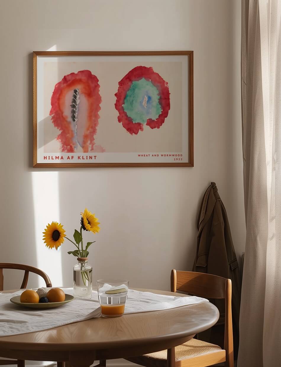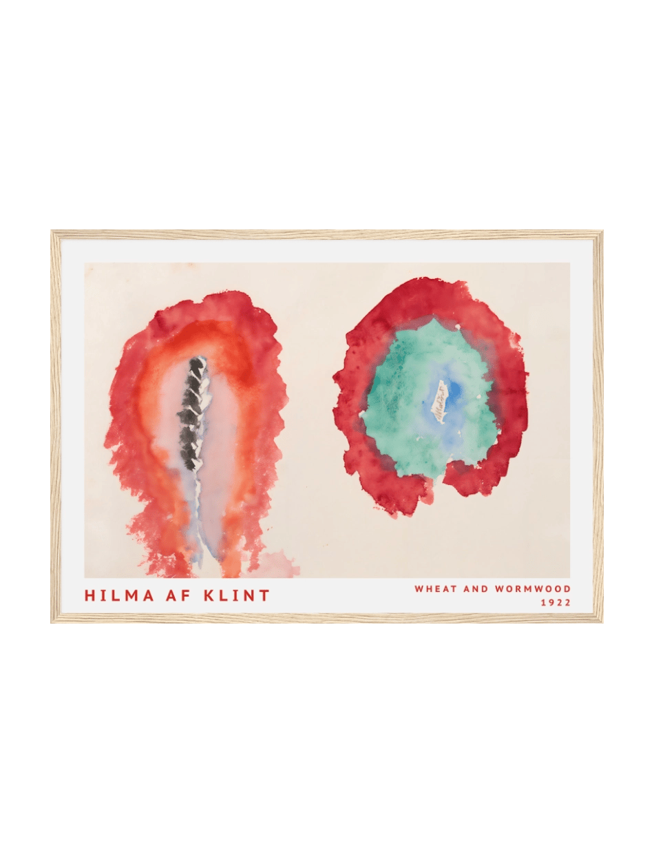 Hilma af Klints ‘Hvede og Malurt’ indfanger naturens dualitet i en enkel, men kraftfuld komposition. To kontrasterende cirkulære former udforsker livets cyklus og spændingen mellem vækst og forfald.