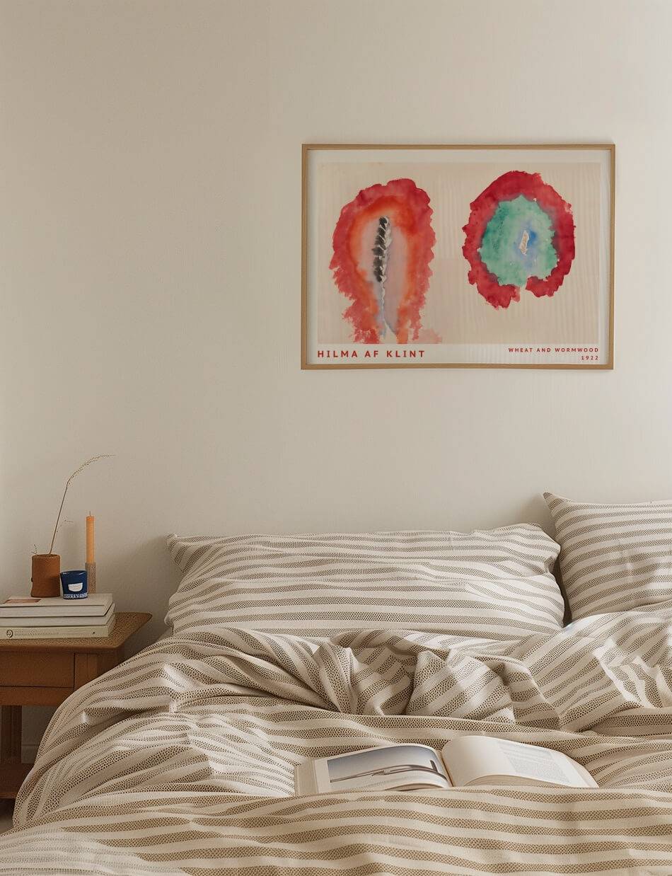 Hilma af Klints ‘Hvede og Malurt’ indfanger naturens dualitet i en enkel, men kraftfuld komposition. To kontrasterende cirkulære former udforsker livets cyklus og spændingen mellem vækst og forfald.