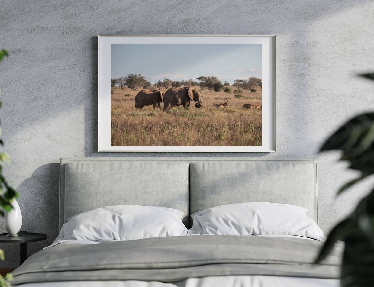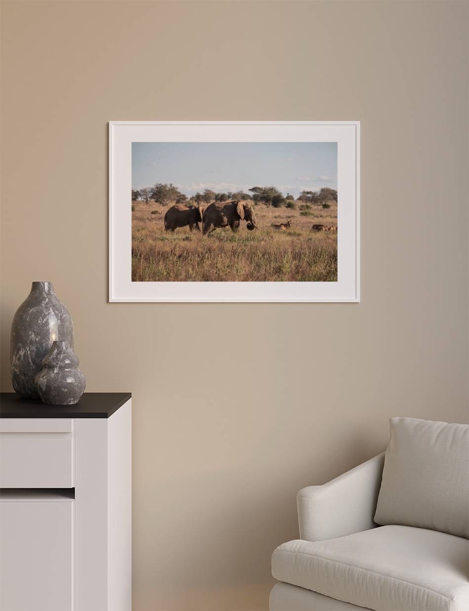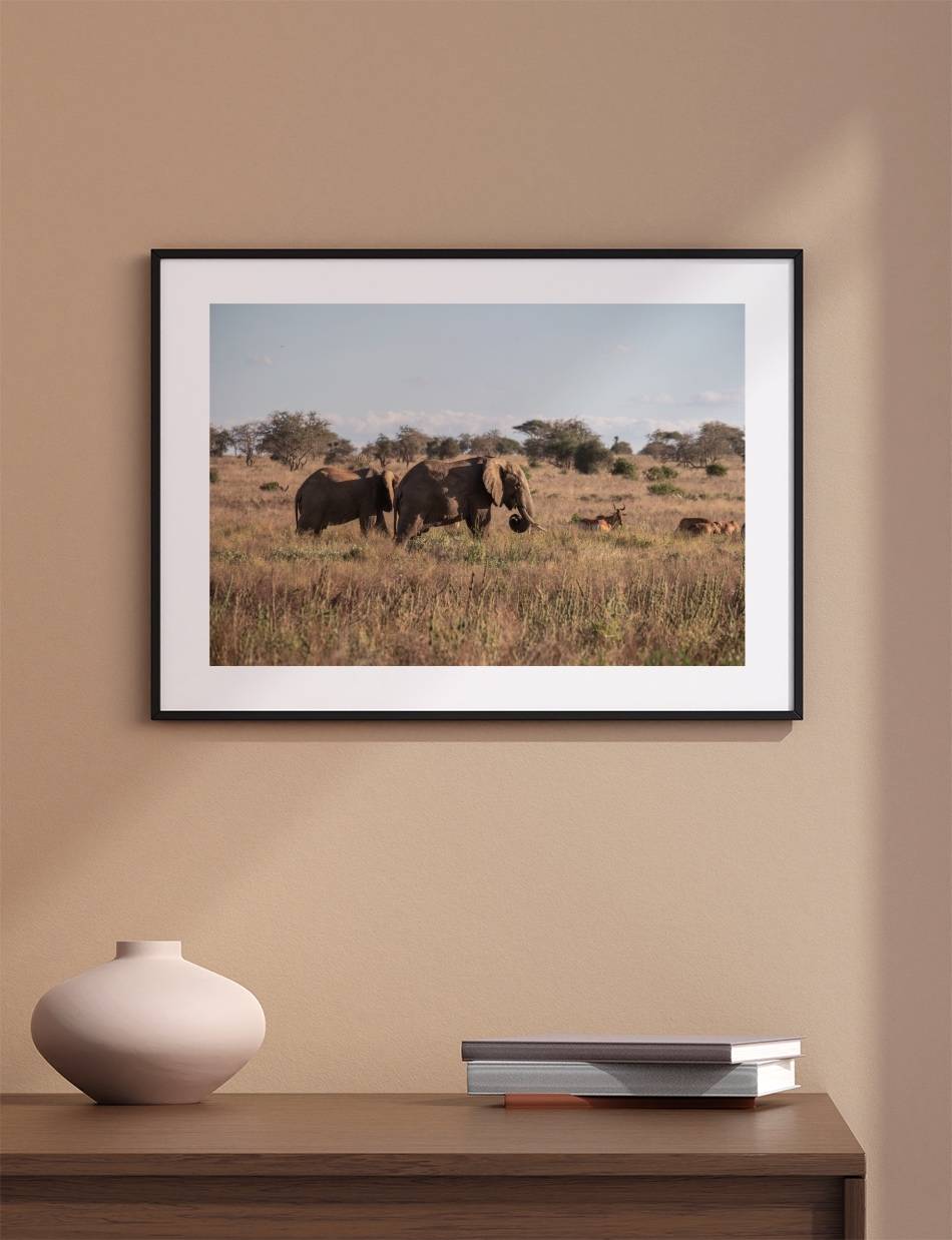 Wild Elephants plakaten formidler styrke og ro med sit majestætiske billede af en vilde elefanter i sin naturlige habitat. Den indfanger elefantens imponerende nærvær og skønheden i det vilde. En kraftfuld tilføjelse til ethvert hjem, der ønsker at hylde naturens storhed.