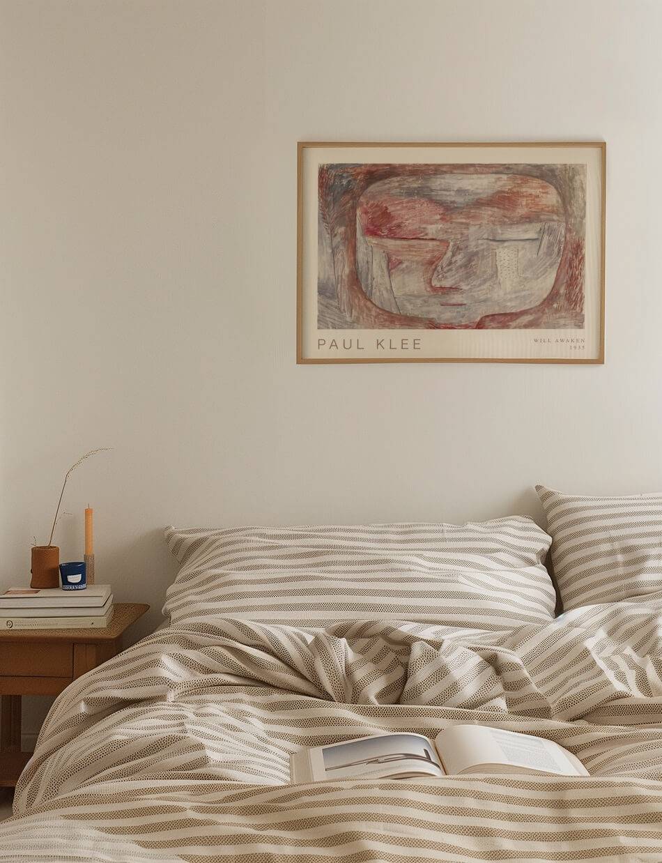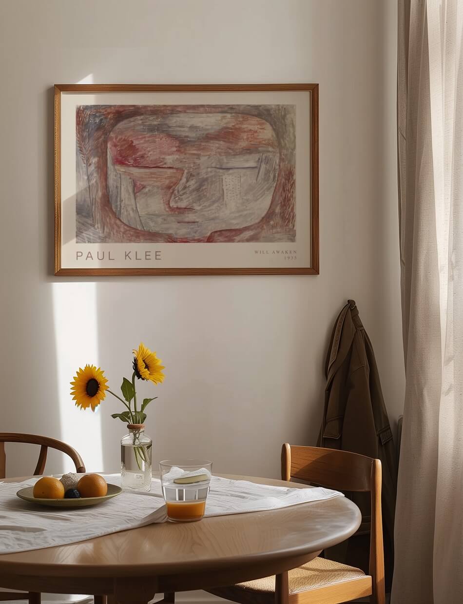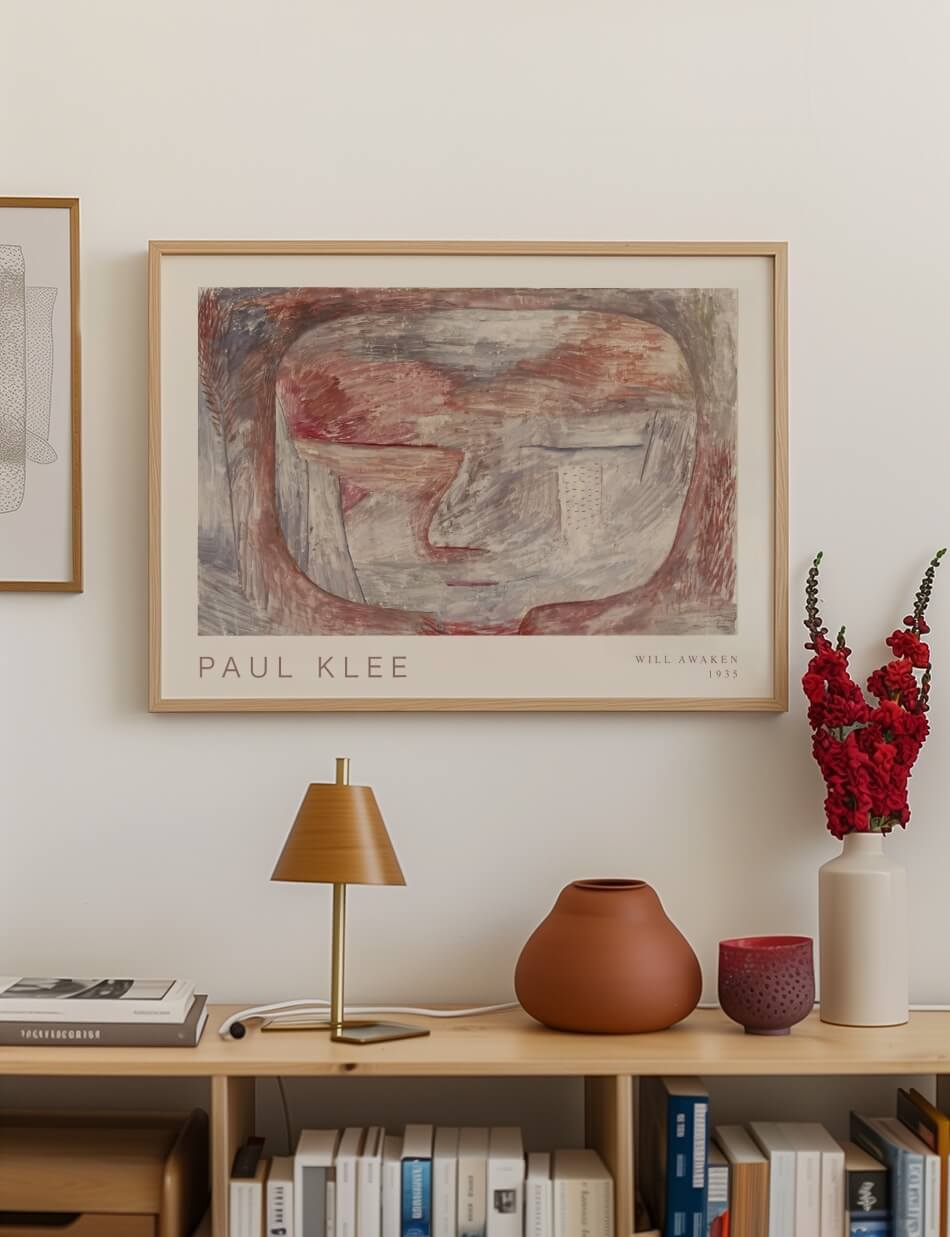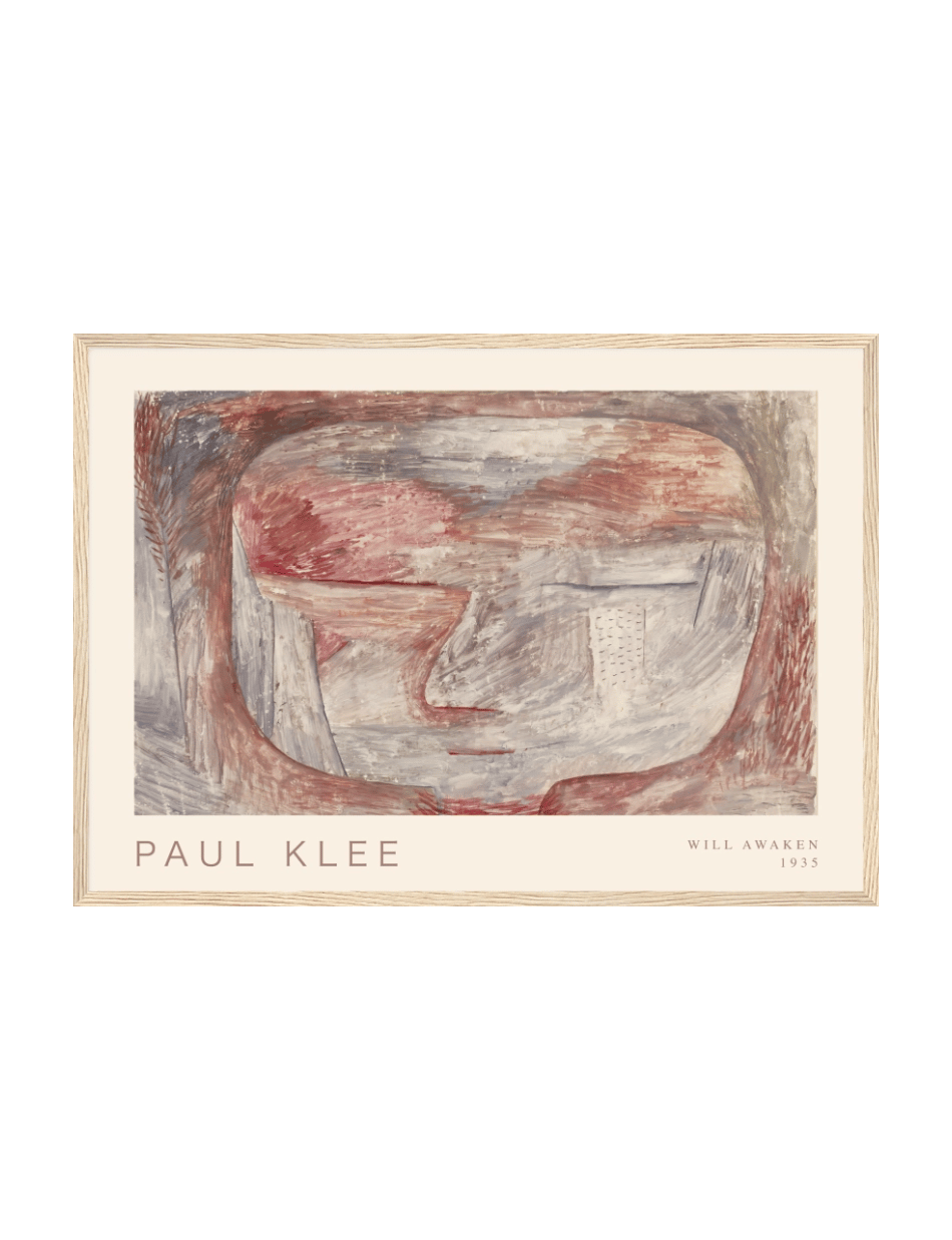 Wird erwachen (Will Awaken) af Paul Klee fra 1935 inviterer dig ind i en drømmeagtig verden, hvor linjer og farver smelter sammen i en subtil symfoni. Dette værk kombinerer bløde, dæmpede toner i røde og grå nuancer med delikate, teksturerede penselstrøg, der fremmaner en følelse af ro og refleksion. Ansigtets konturer antydes med en minimalistisk tilgang, som efterlader plads til beskuerens egen fortolkning, mens de abstrakte former vækker en følelse af en stille opvågning.
