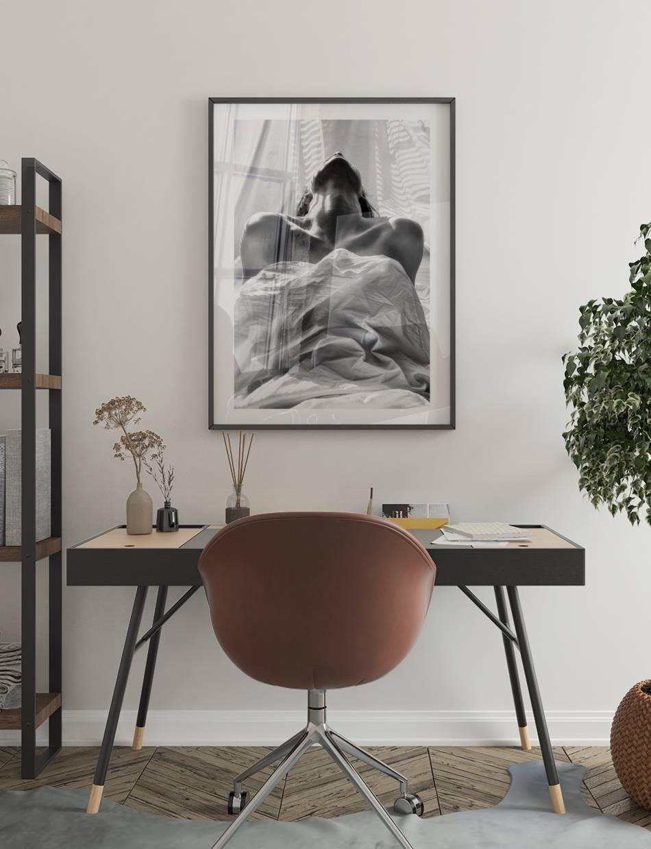 Vores Woman in Sheets plakat skildrer en afslappet og introspektiv stemning, ideel til et soveværelse.