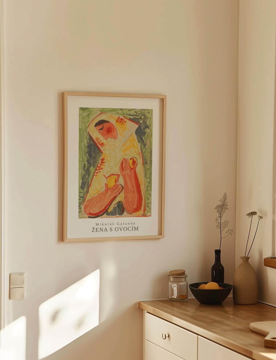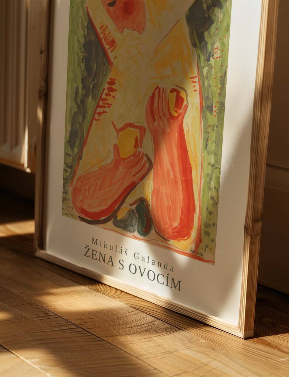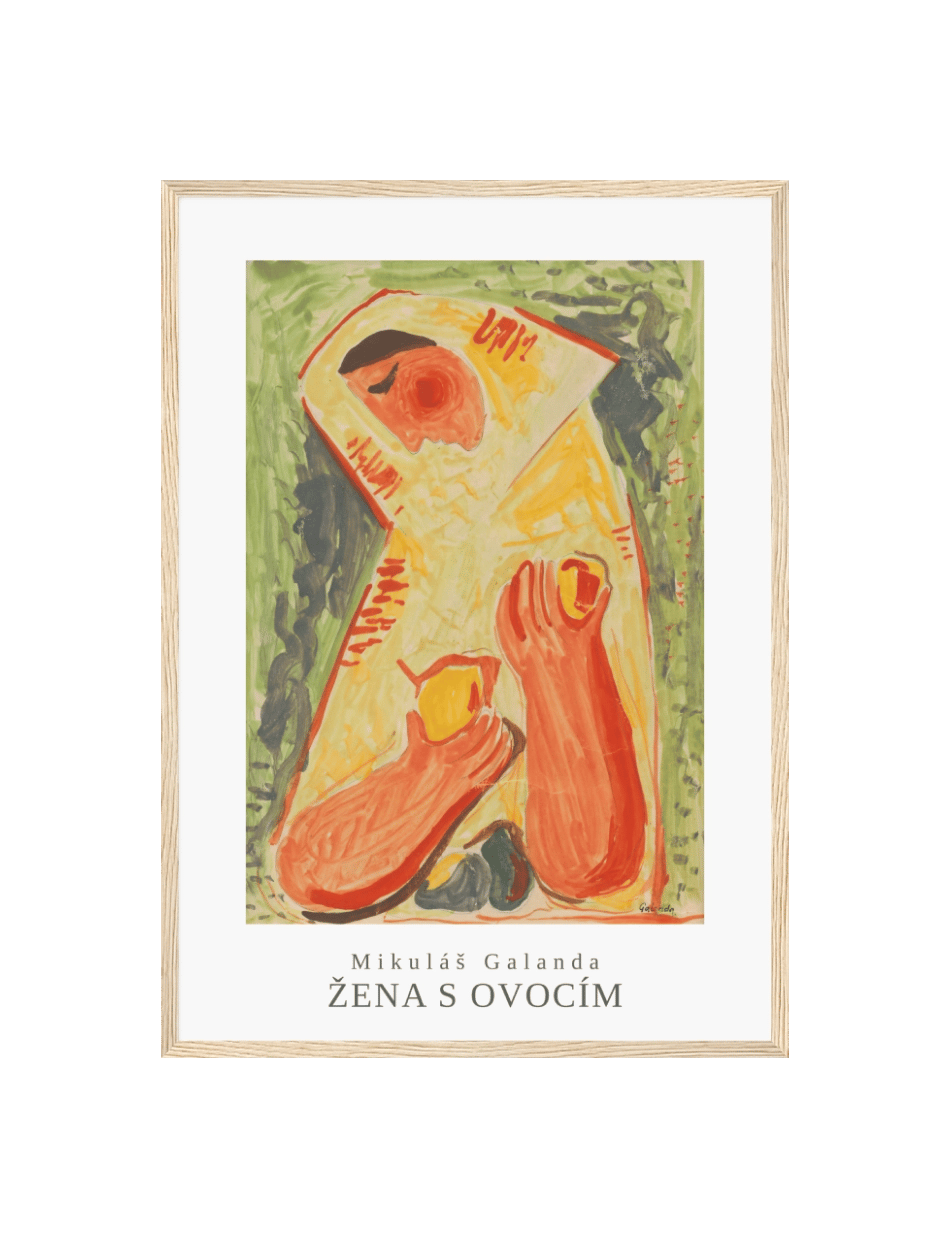 Zena S Ovocim af Mikuláš Galanda er et livligt og ekspressivt værk, der fremhæver forbindelsen mellem mennesket og naturen. Den centrale figur holder frugter i sine hænder, hvilket symboliserer overflod, nærhed og livets cyklus. De varme røde og gule toner kontrasterer smukt med de grønne baggrunde og skaber en visuel balance, der fremhæver værkets organiske og naturlige essens.