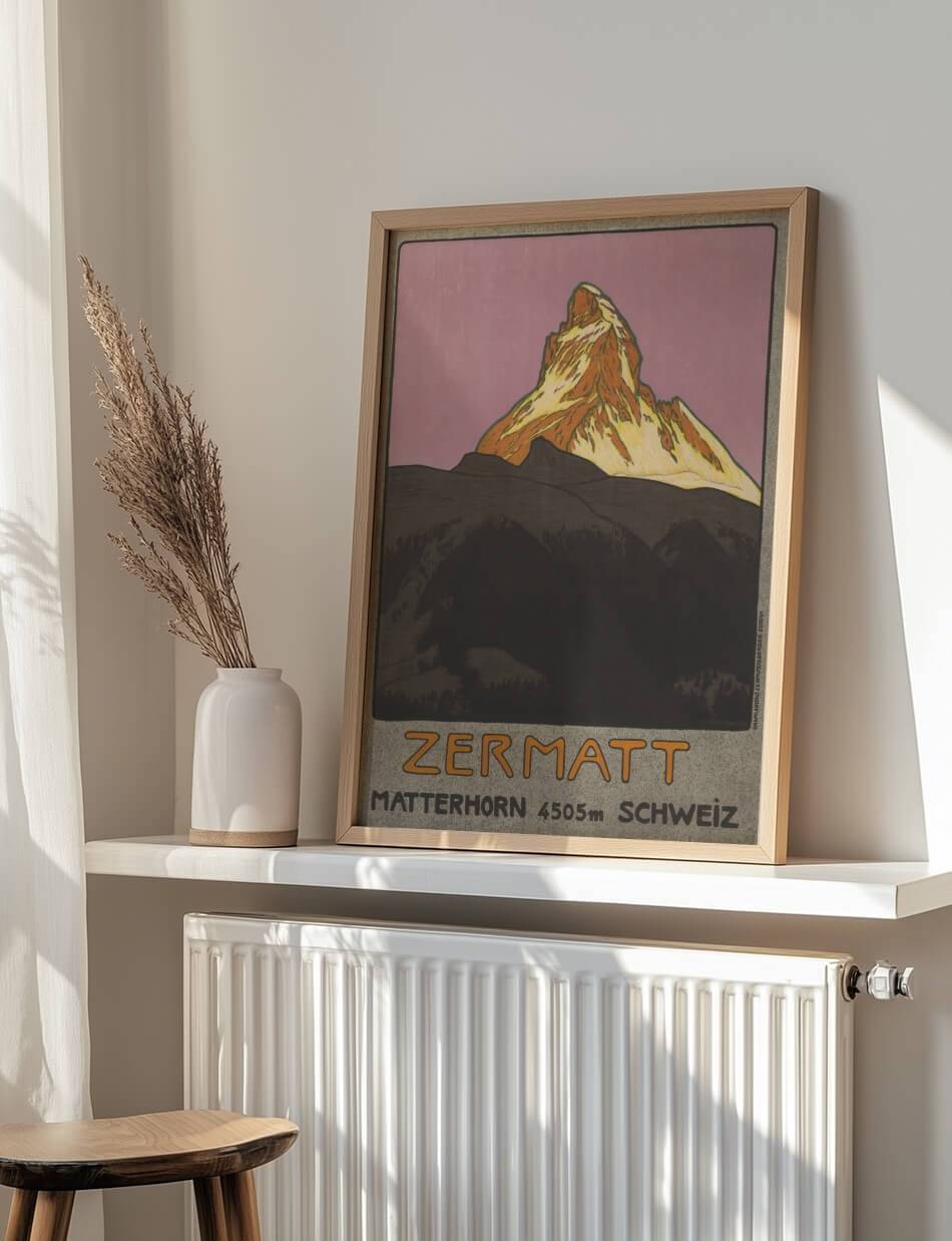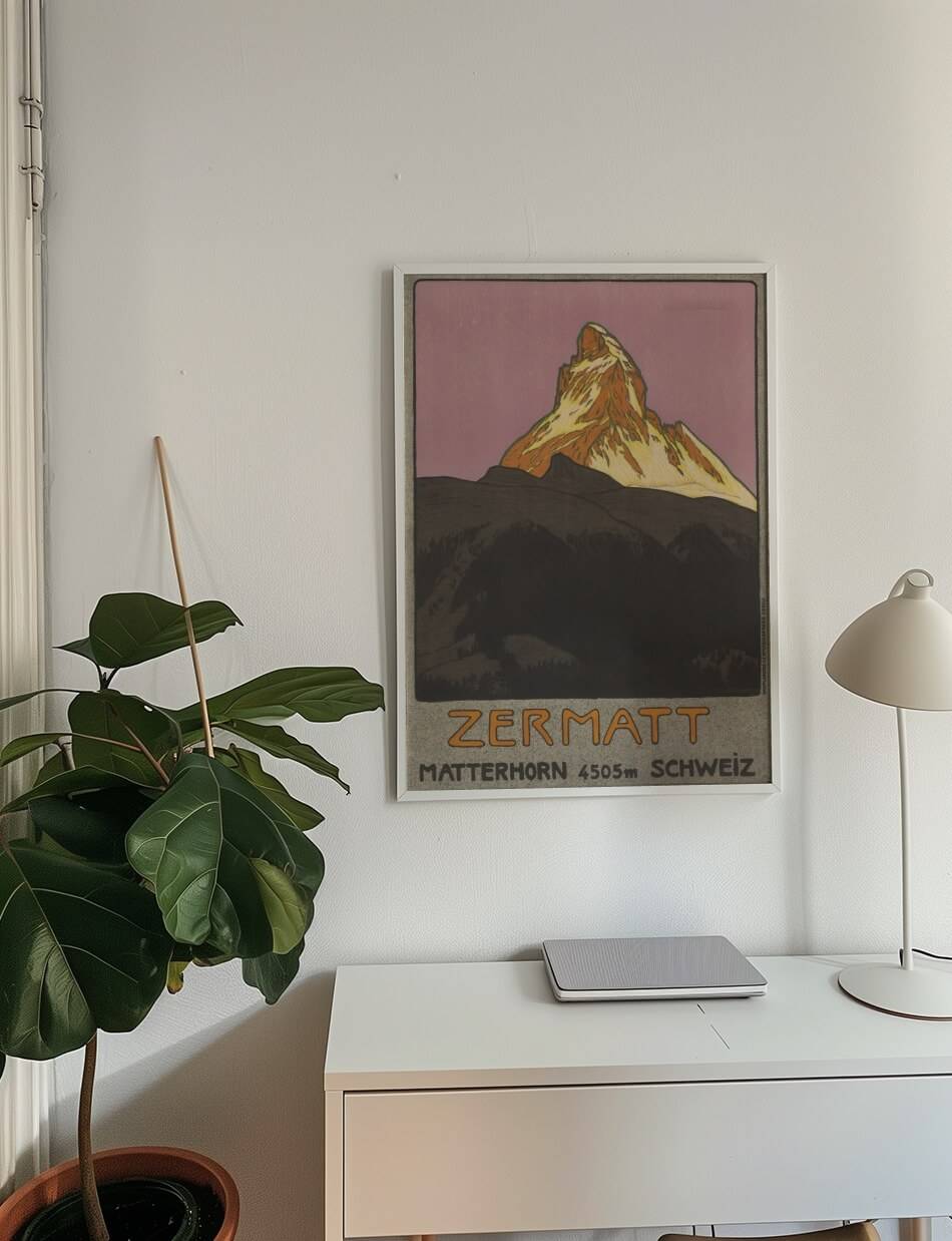 Med sin enkle, men slående æstetik, inviterer dette kunstværk beskueren til at opleve det berømte schweiziske landemærke. Perfekt for rejseentusiaster, naturelskere og dem, der værdsætter vintage alpin kunst.