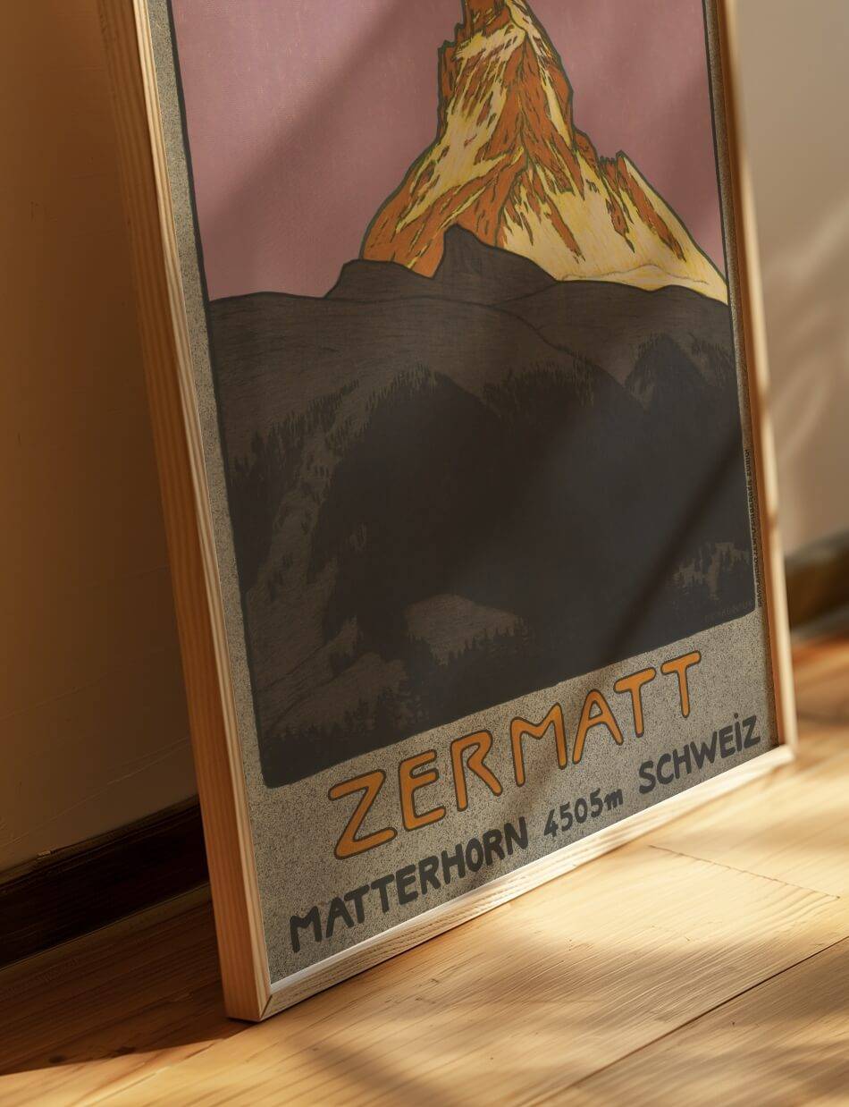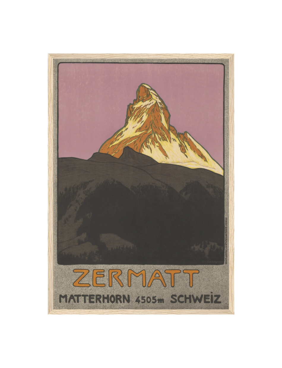 Denne ikoniske rejseplakat af Theodor Barth fanger den imponerende skønhed af Matterhorn. Den karakteristiske pyramideformede bjergtop er afbildet i varme gule og orange nuancer, der står i kontrast til de mørke forgrundsbjerge og den lyserøde himmel. Plakaten formidler bjergets majestætiske ensomhed og dragende kraft.