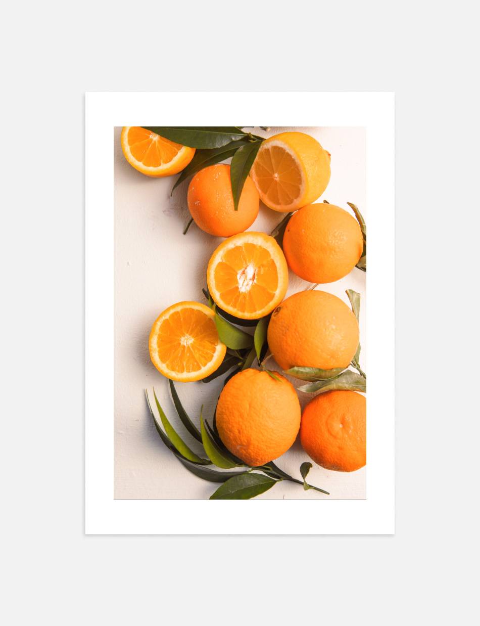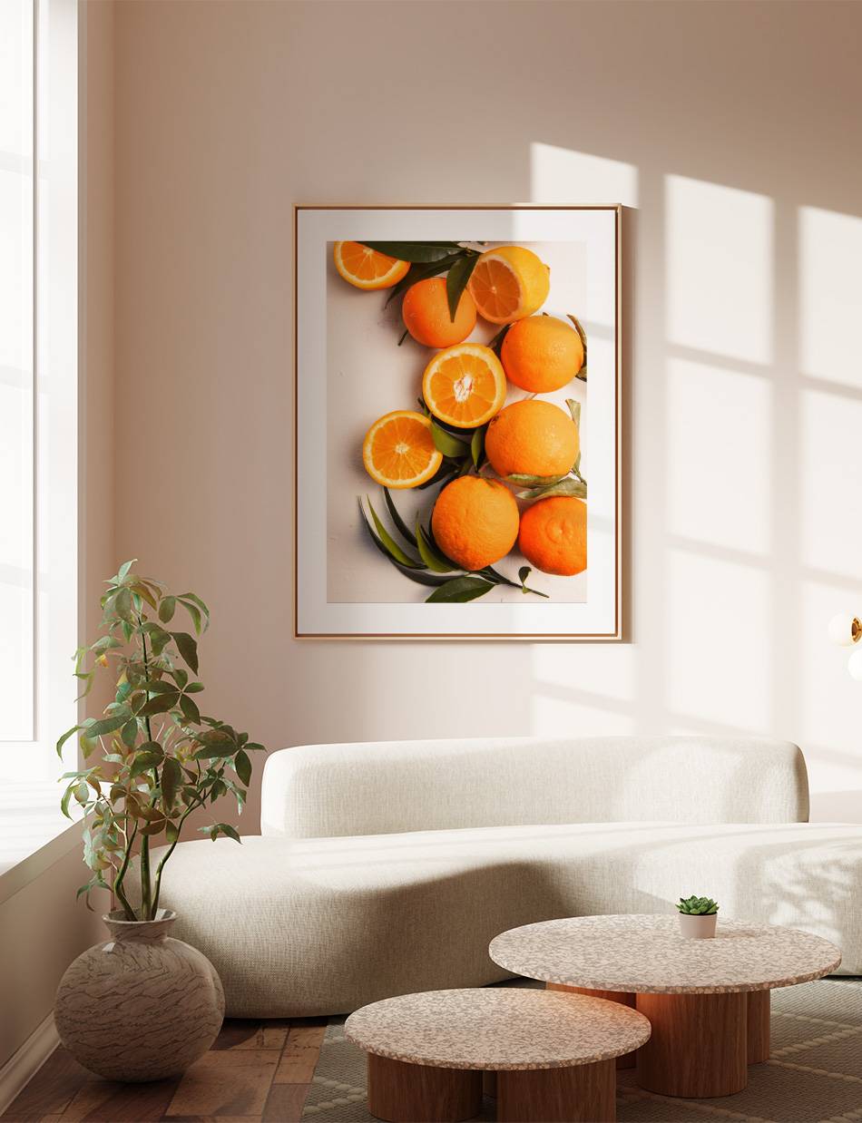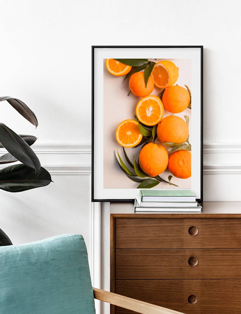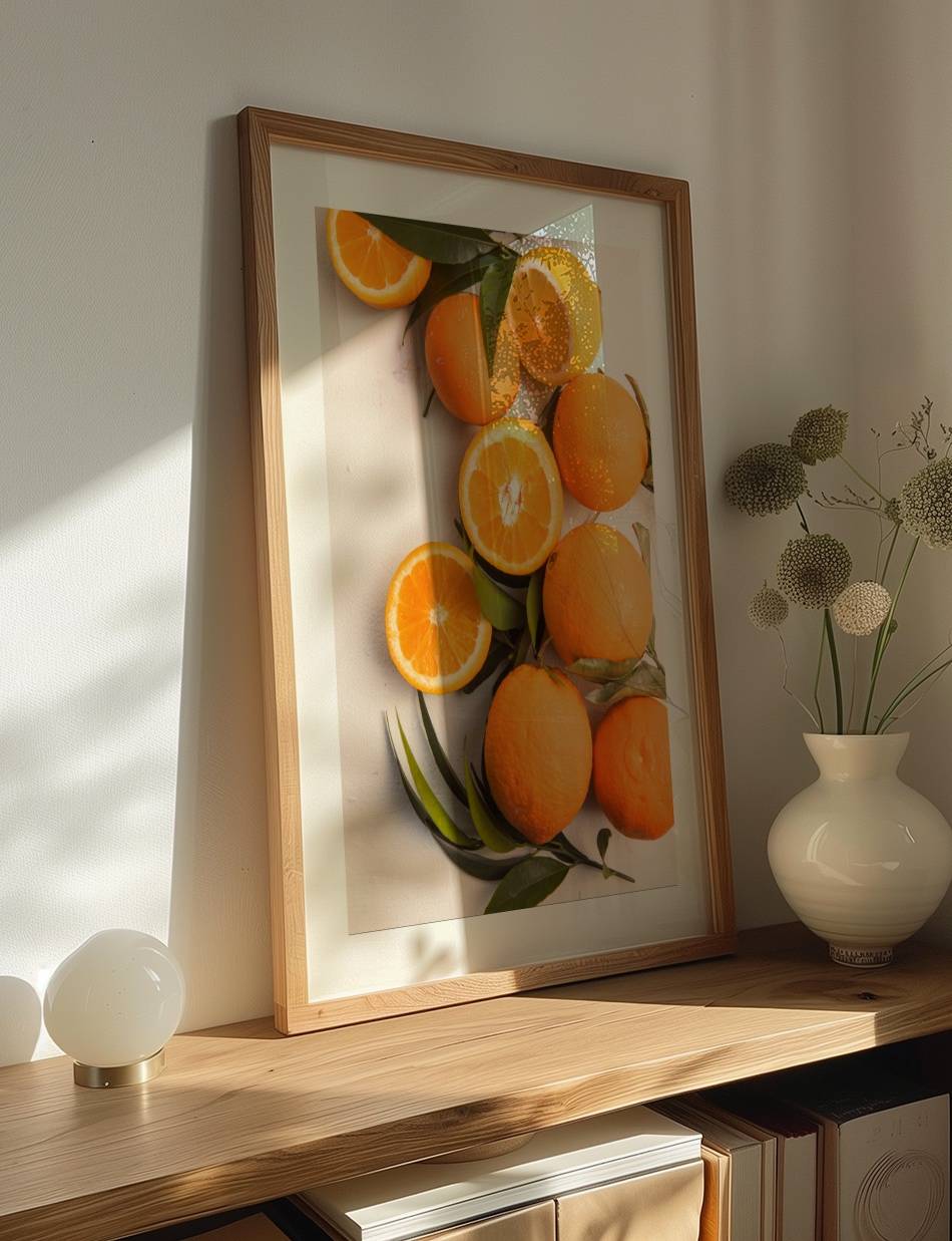 Lad denne livlige fotoplakat af modne appelsiner vække dine sanser til live. Denne plakat fanger essensen af friskhed og vitalitet, hvilket gør den til en sprudlende tilføjelse i køkkenet eller spisestuen.